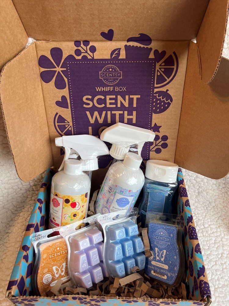 Scentsy goodies in a box. 4 packs of wax melts, counter cleaner, odor eliminating fabric spray, body wash
