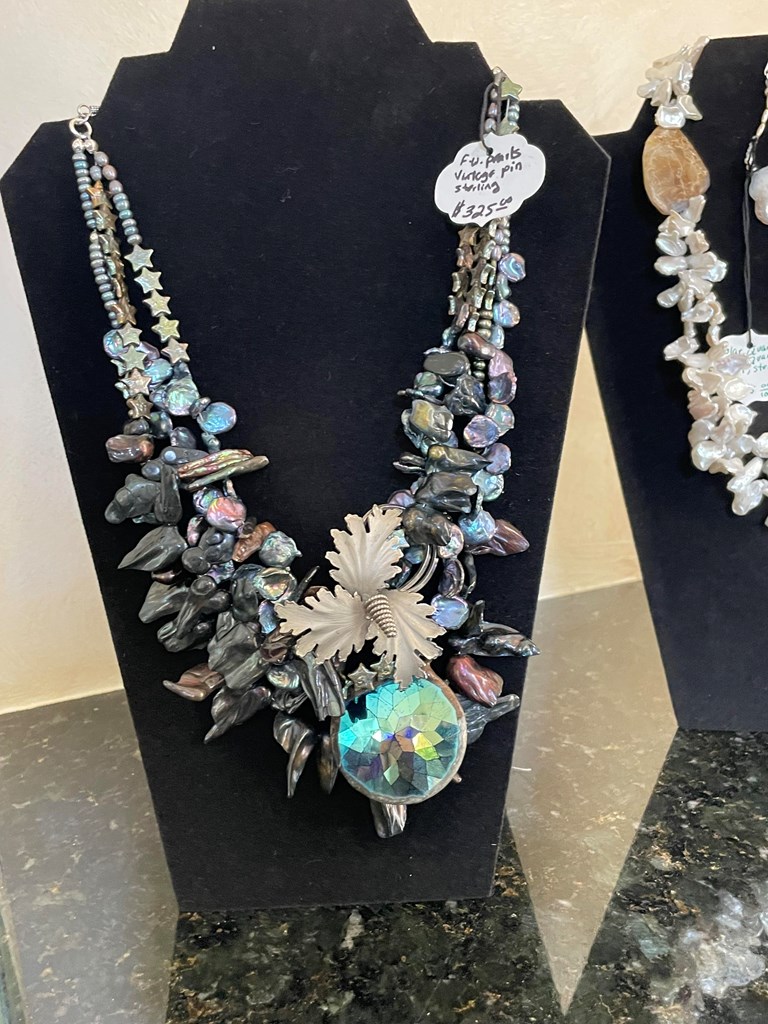 NEALOO NECKLACE #1. Stunning 4-Strand of Dark Freshwater Pearls, Adjustable Length Necklace with a vintage sterling silver pin and a large blue optic pendant. Really a remarkable piece.
