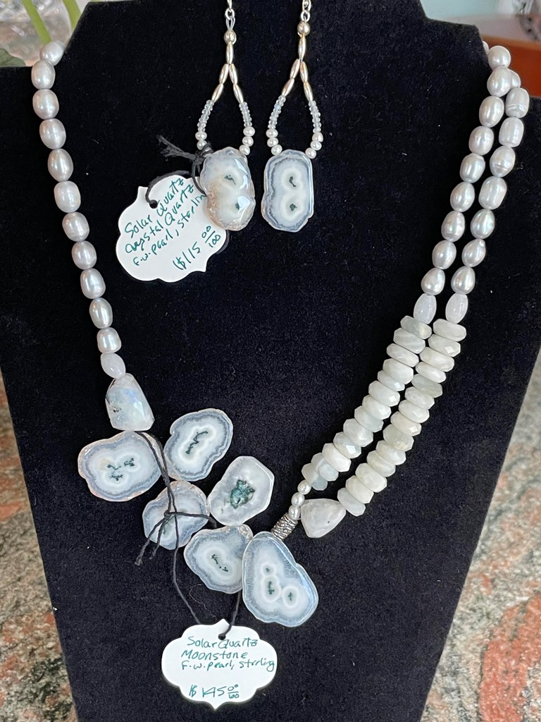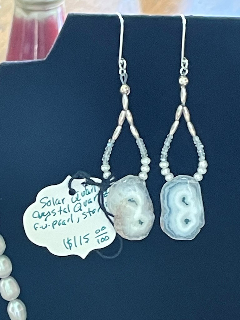 Beautiful Solar Quartz, Crystal Quartz, Freshwater Pearl and Sterling Earrings. Nealoo Earrings 1.