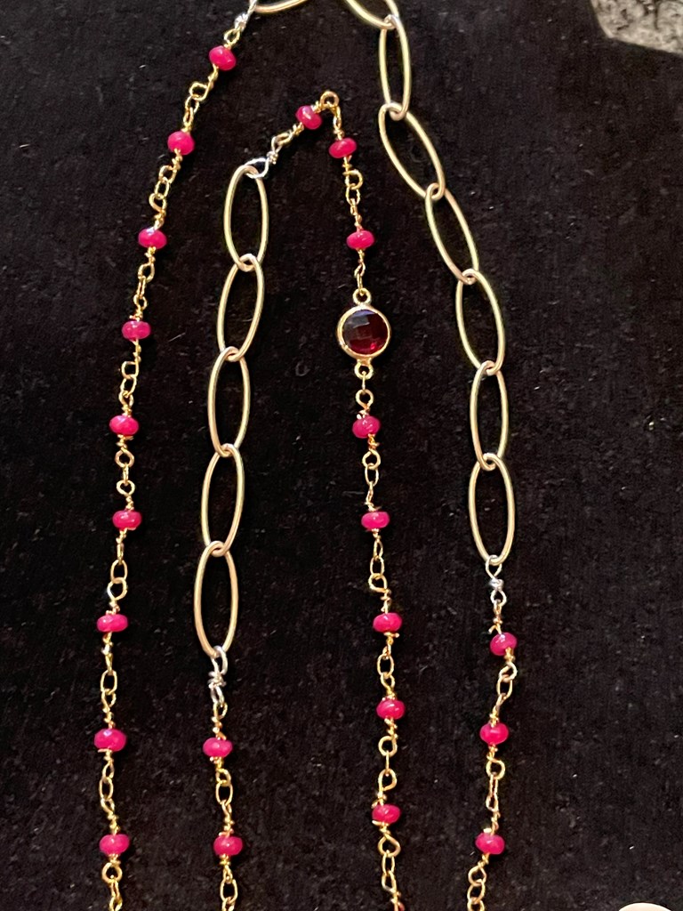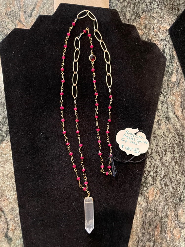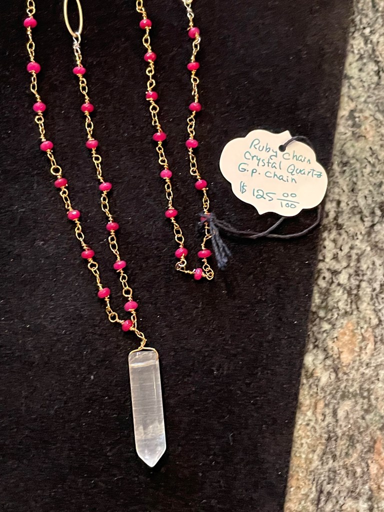 Delicate Ruby Chain with Dangling Crystal Quartz Pendant, Gold Plate Chain. Nealoo Necklace 10.