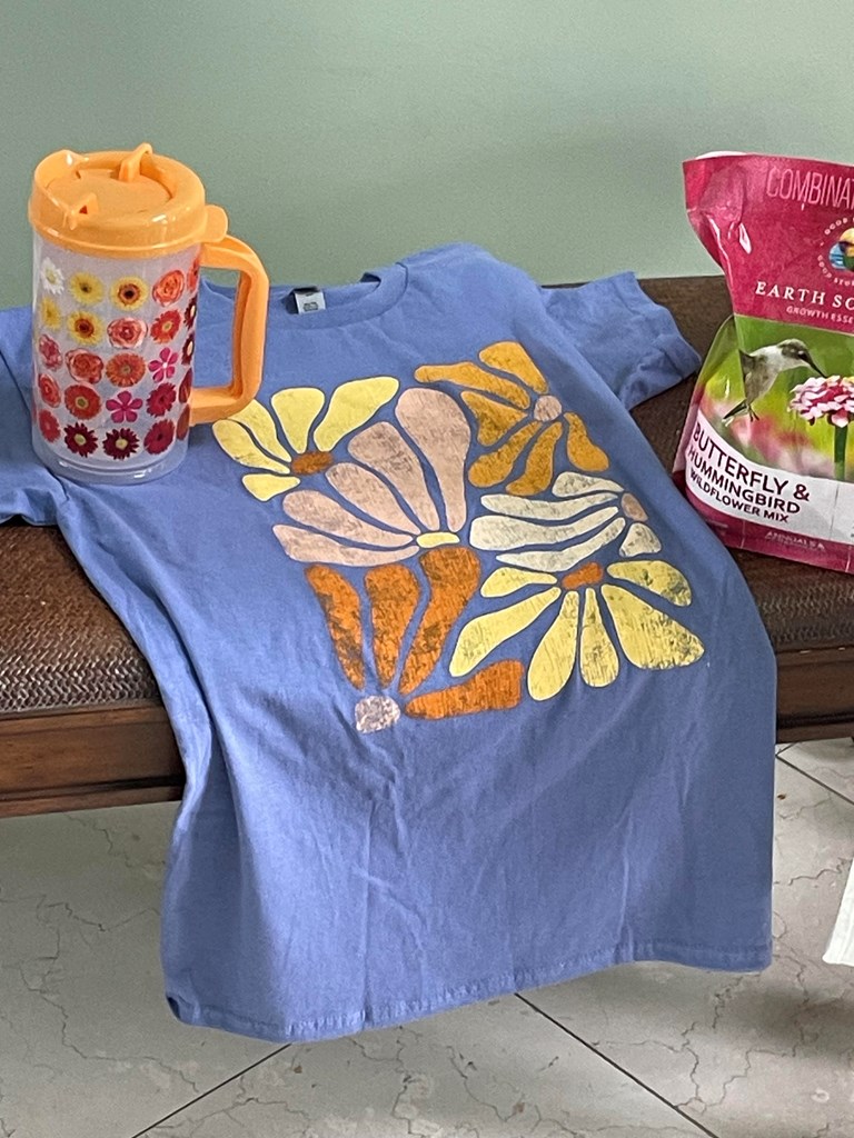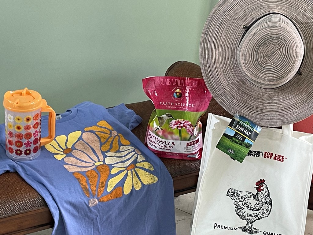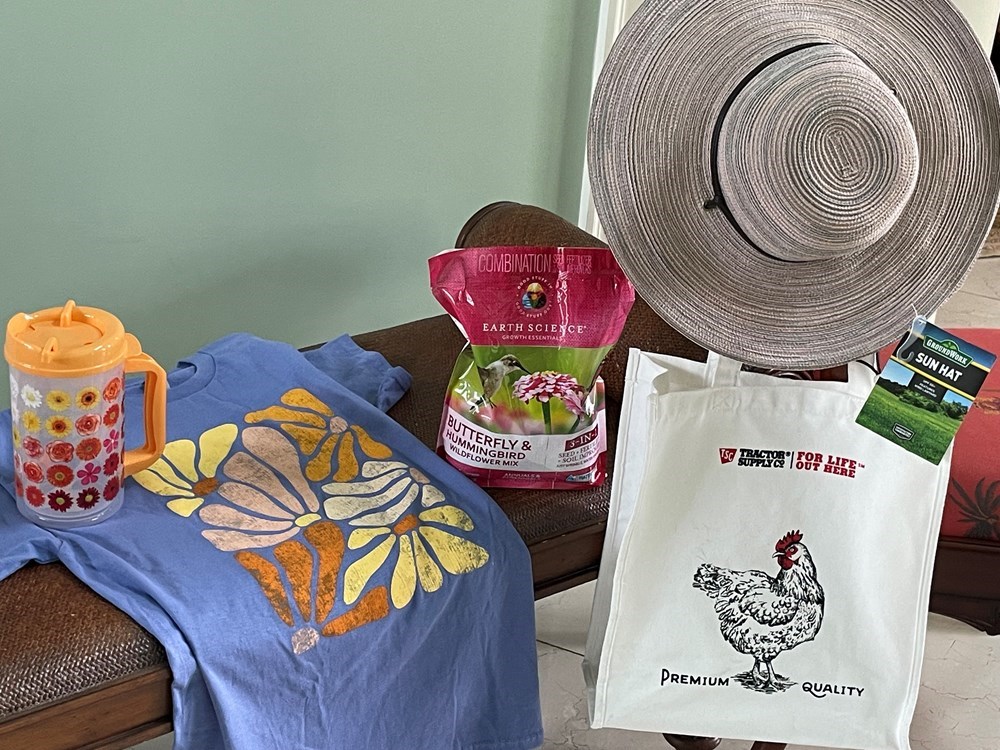 Tractor Supply Nice White Bag of Yard Goodies - Large Sun Hat, T-Shirt, Butterfly&Hummingbird Wildflower Mix, Plastic Water Bottle with Straw.